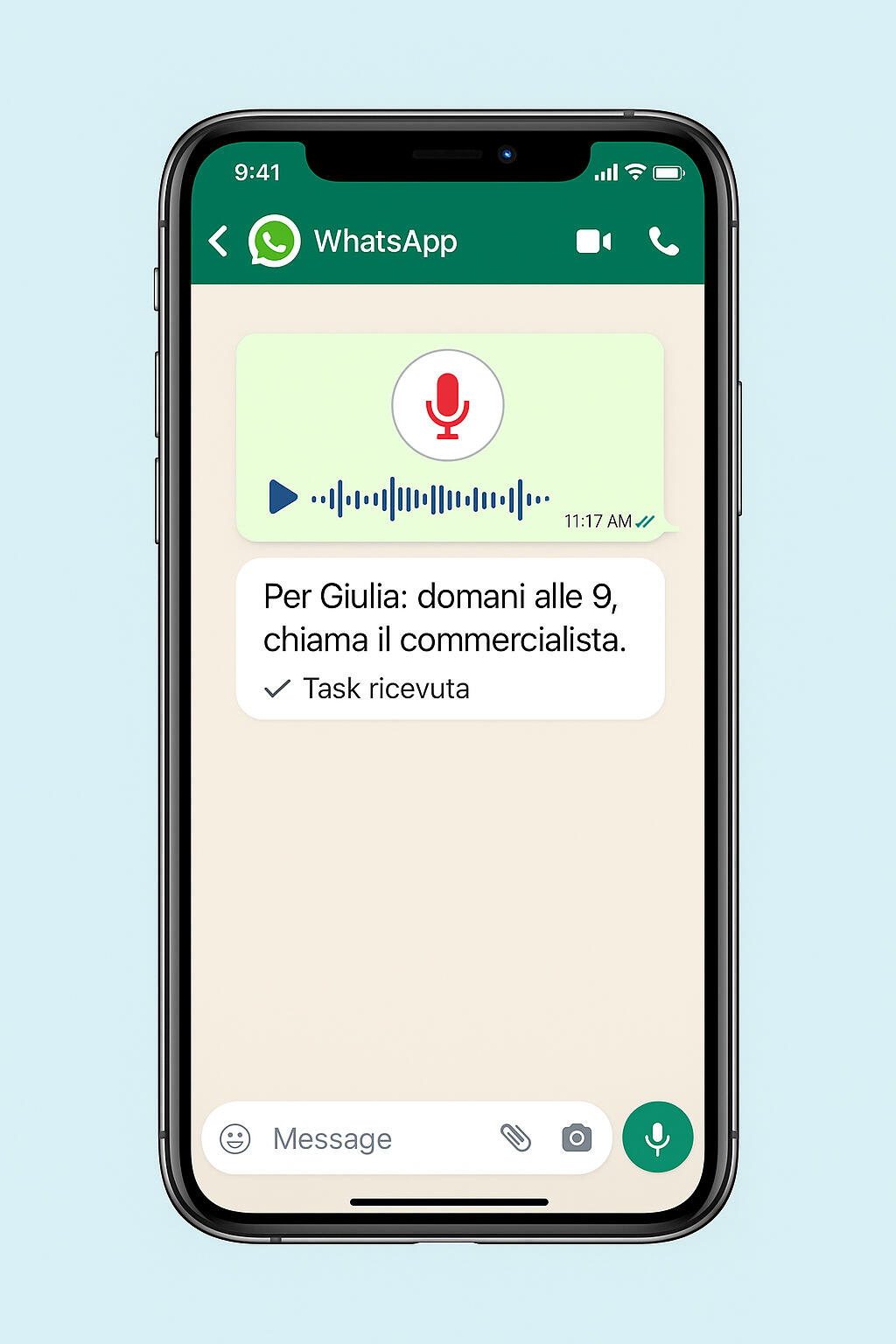 Gli scrivi (o mandi un vocale) su WhatsApp, e lui trasforma il tuo messaggio in un task chiaro con reminder. Tutto automatico.
