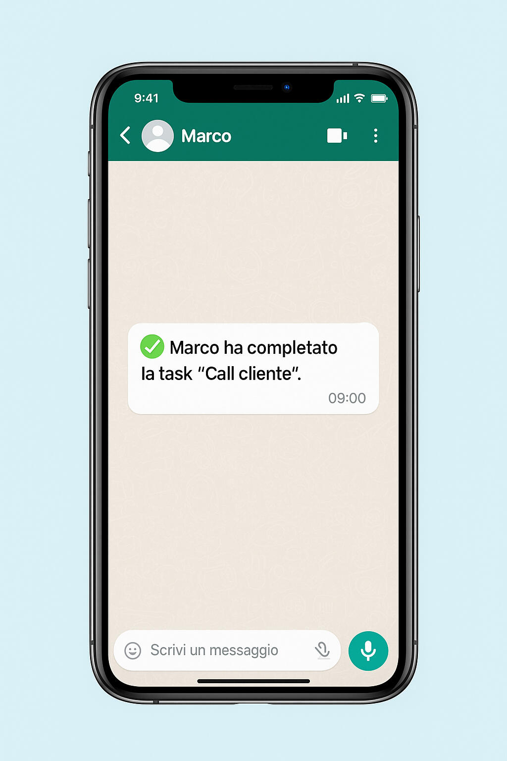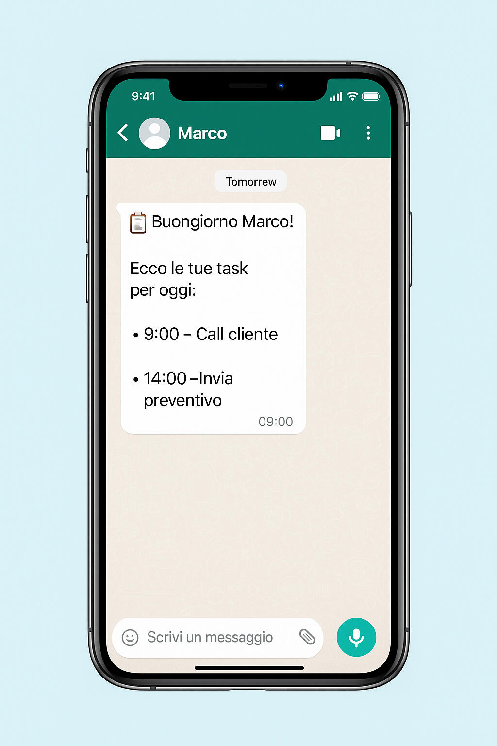 Gli scrivi (o mandi un vocale) su WhatsApp, e lui trasforma il tuo messaggio in un task chiaro con reminder. Tutto automatico.